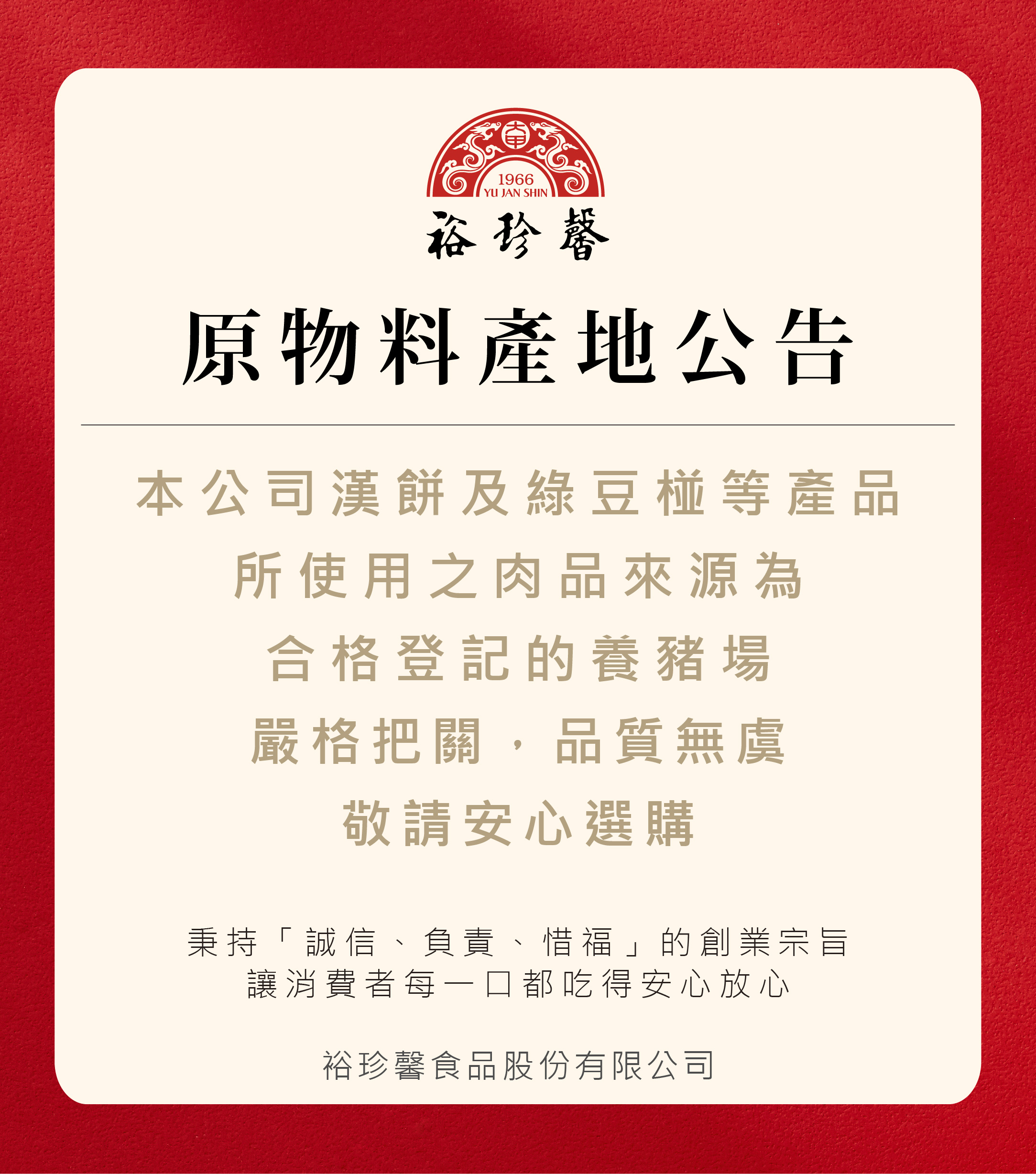 裕珍馨原物料公告 本公司漢餅及綠豆椪等產品,所使用之肉品來源為合格登記的養豬場。 嚴格把關,品質無虞,敬請安心使用。