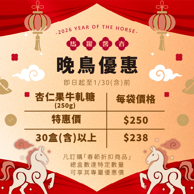 牛軋糖均以手工製成,如因氣溫變化而使牛軋糖變軟或變硬,皆屬正常現象,請安心食用。 |