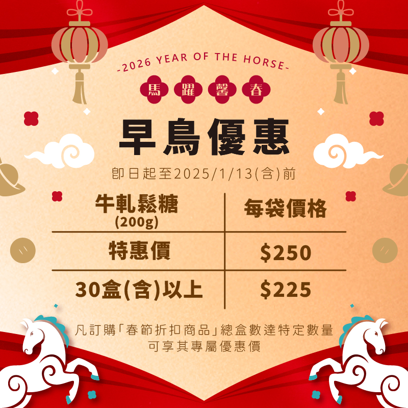 ⚠️2026/1/26-2/10為物流貨量高峰期(春節送禮),請將預訂送達日提前 2–3 天,以避免影響送禮時程。