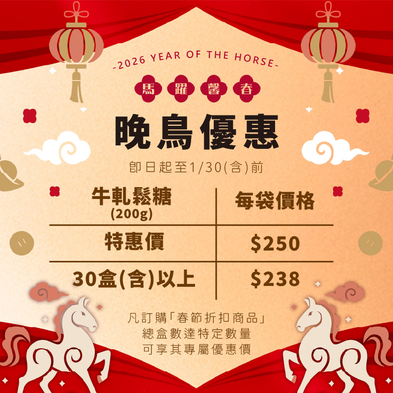 本產品使用之天然奶油,未經人工氫化製程,其反式脂肪源自牛奶本身,不對健康產生負面效應,敬請安心食用。 牛軋鬆糖均以手工製成,如因氣溫變化而使牛軋鬆糖變軟或變硬,皆屬正常現象,請安心食用。 |