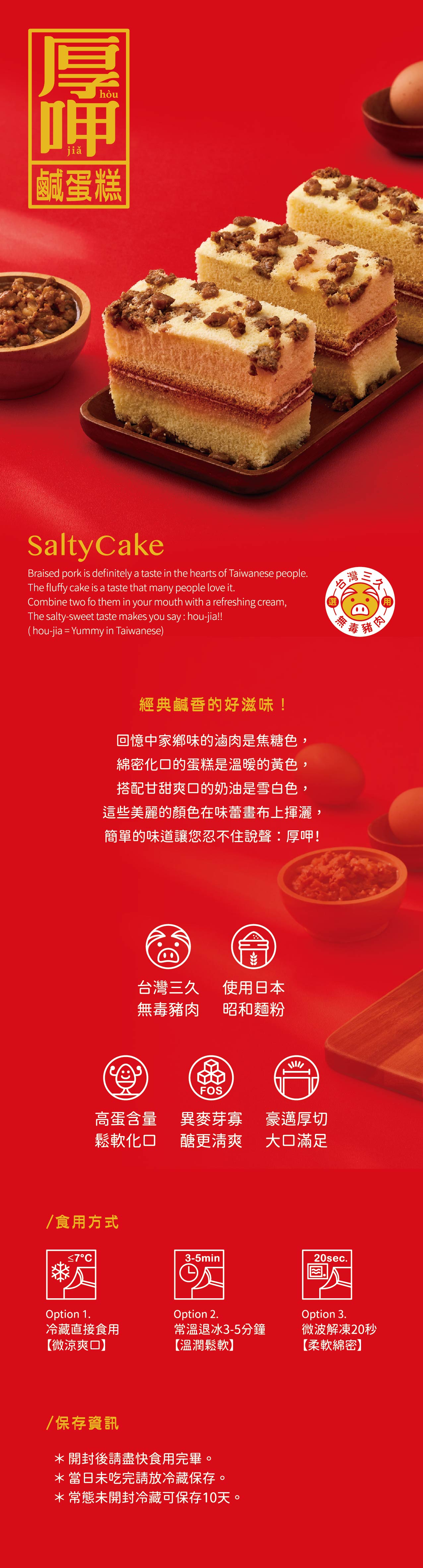 蛋、蔗糖、麵粉、奶油、豬肉、保久乳、滷汁(八角、花椒、肉蔻、桂皮、甘草、白芷、山奈、草菓、茴香、丁香)、乳化油(含軟質棕油、椰子油、硬質棕油、完全氫化硬質棕油)、異麥芽寡醣、味醂【含果糖、糯米、米麴、釀造酢、調味劑(胺基乙酸、檸檬酸鈉、DL-胺基丙酸、5-次黃嘌呤核苷磷酸二鈉、5-鳥嘌呤核苷磷酸二鈉)】、紅蔥頭、醬油、食鹽、蒜頭、塔塔粉(酒石酸氫鉀、酸性焦磷酸鈉、樹薯粉、麥芽糊精)、麥芽糖、香料(中鏈三酸甘油酯、香料、焦糖色素)、胡椒粉(麩皮粉、麥芽糊精、綠辣椒、胡椒、玉米澱粉、辣椒、茶枝、八角、當歸)、檸檬酸 |