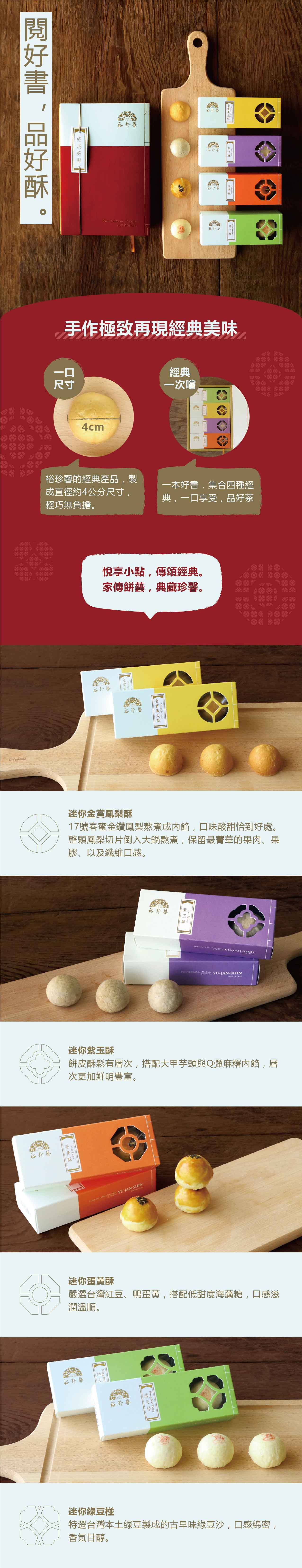 | 品名 | 迷你金賞鳳梨酥 | 迷你蛋黃酥 | 迷你綠豆椪 | 迷你紫玉酥 |